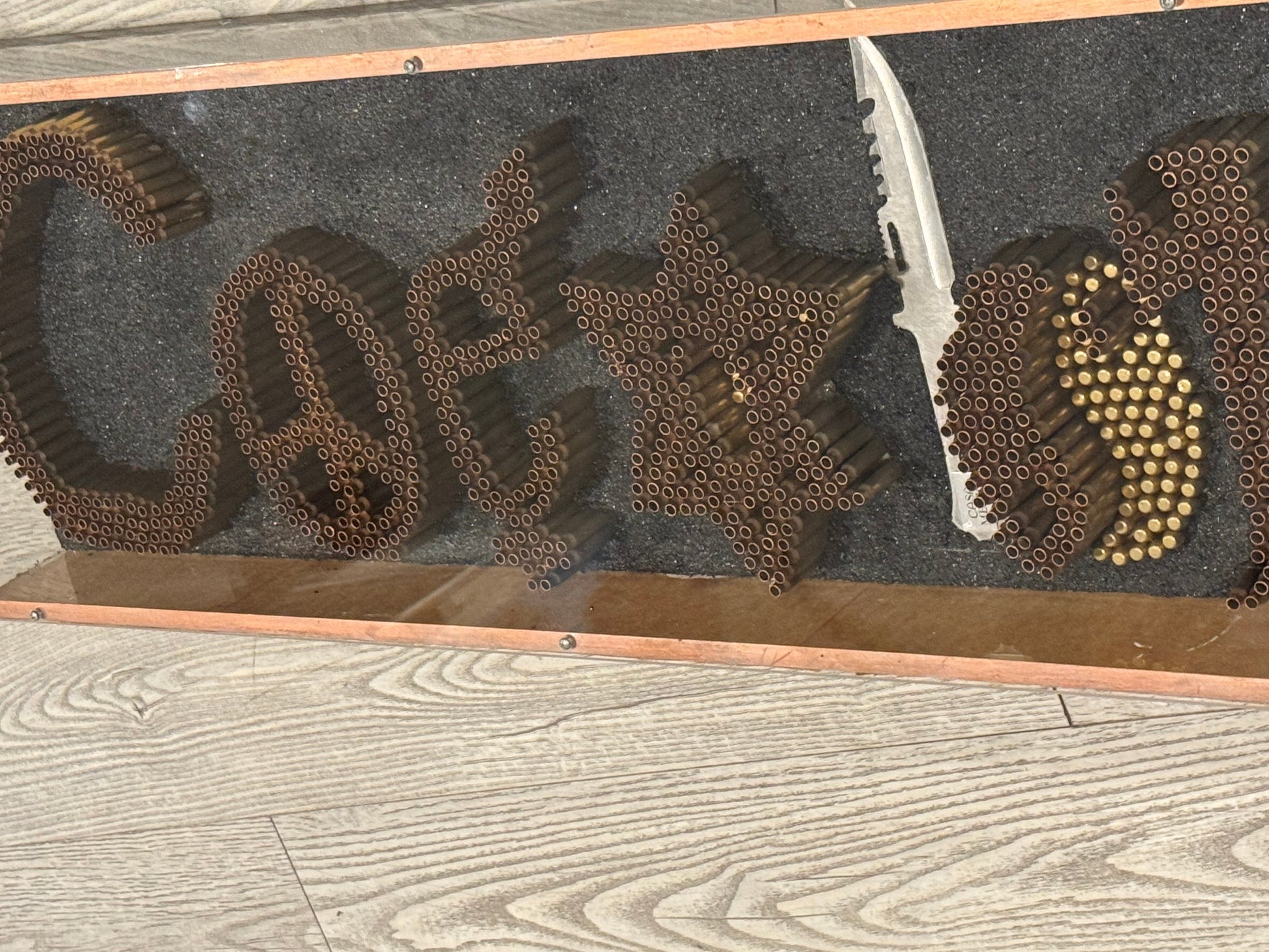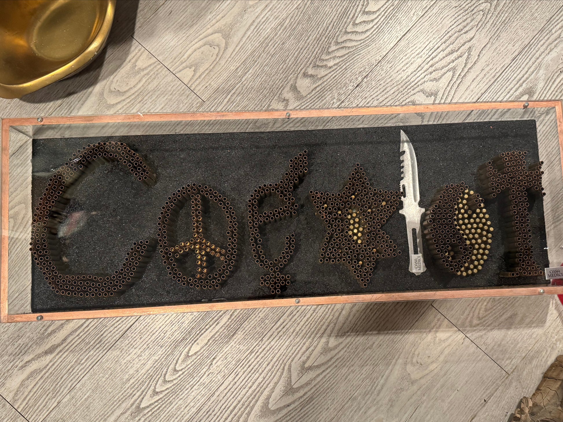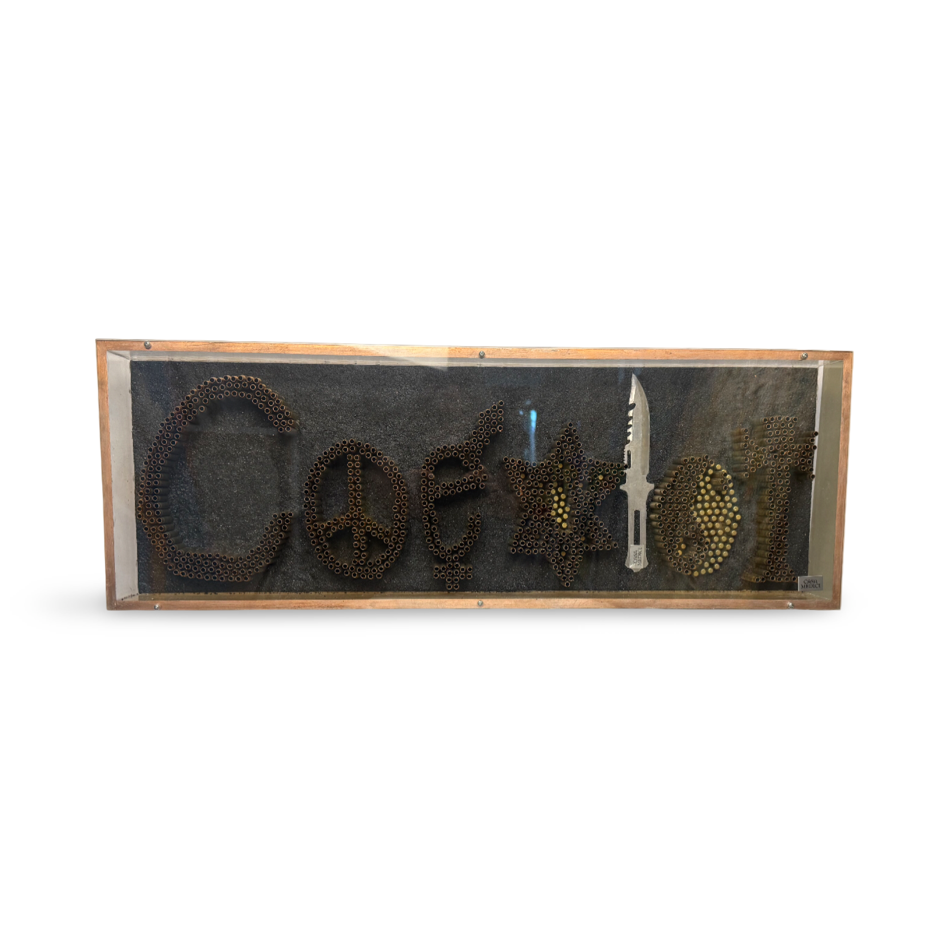 A "tongue & cheek" piece of bespoke art spelling out the word "Coexist" with bullet shells and a dagger forming symbolized lettering and encased in an acrylic box. Original art by Luis Antolin & Tal McAbian/ one of a kind.