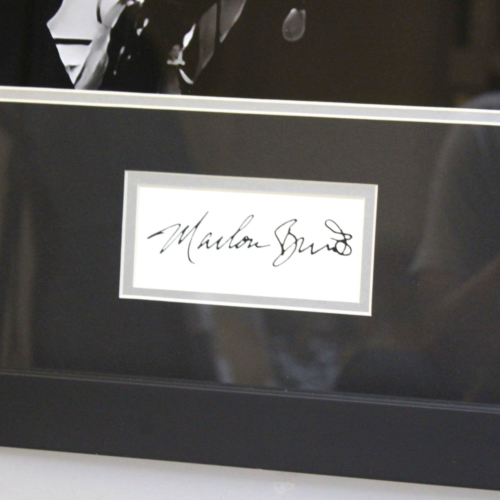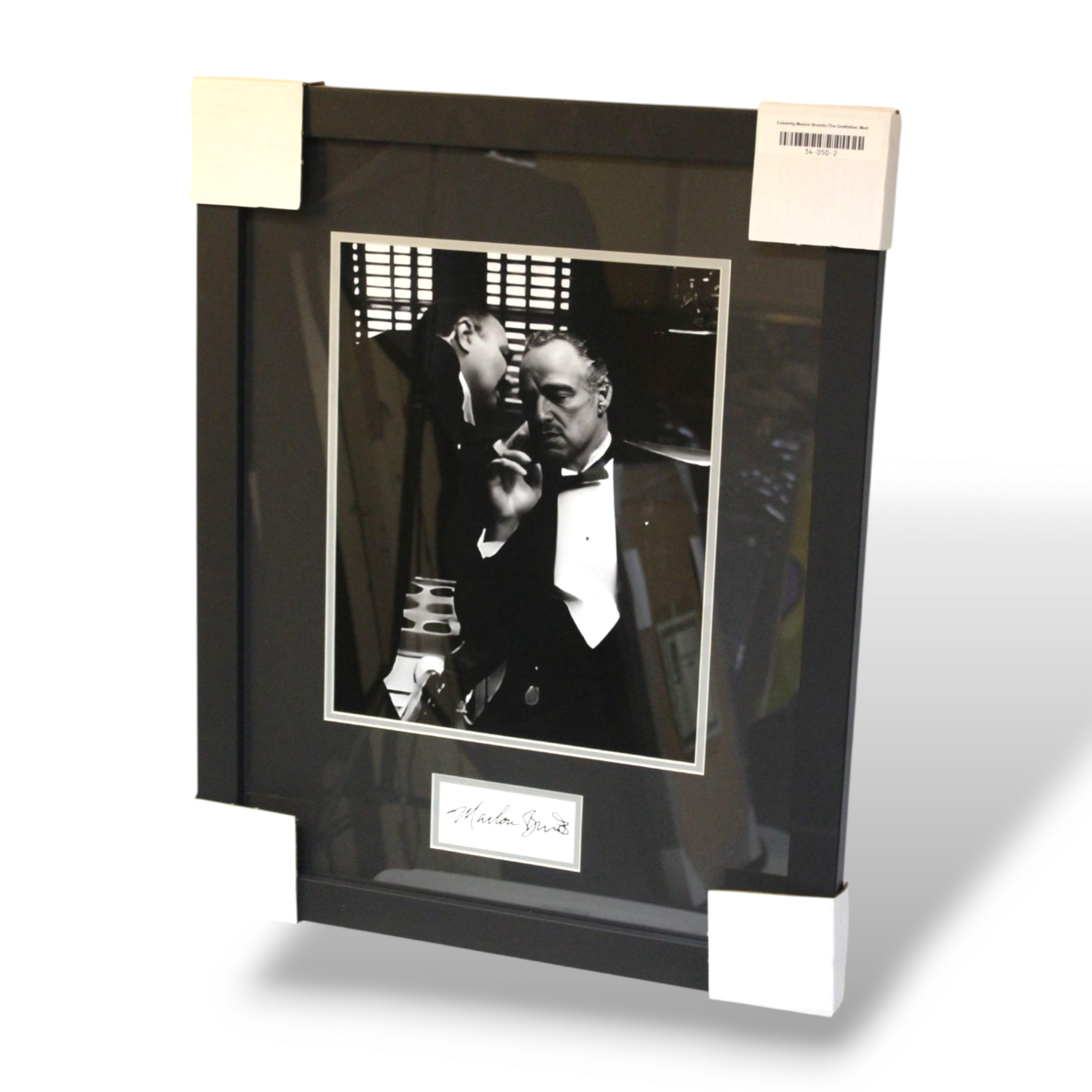 This striking black-and-white framed photograph captures Marlon Brando in his iconic role as Don Vito Corleone from Francis Ford Coppola’s 1972 masterpiece, The Godfather. Known for his brooding charisma and unforgettable presence, Brando’s performance won him an Academy Award and solidified the film’s place in cinematic history. This piece includes a replica of Brando’s signature, elegantly matted and professionally framed—perfect for collectors of classic Hollywood, crime cinema, or legendary performances.