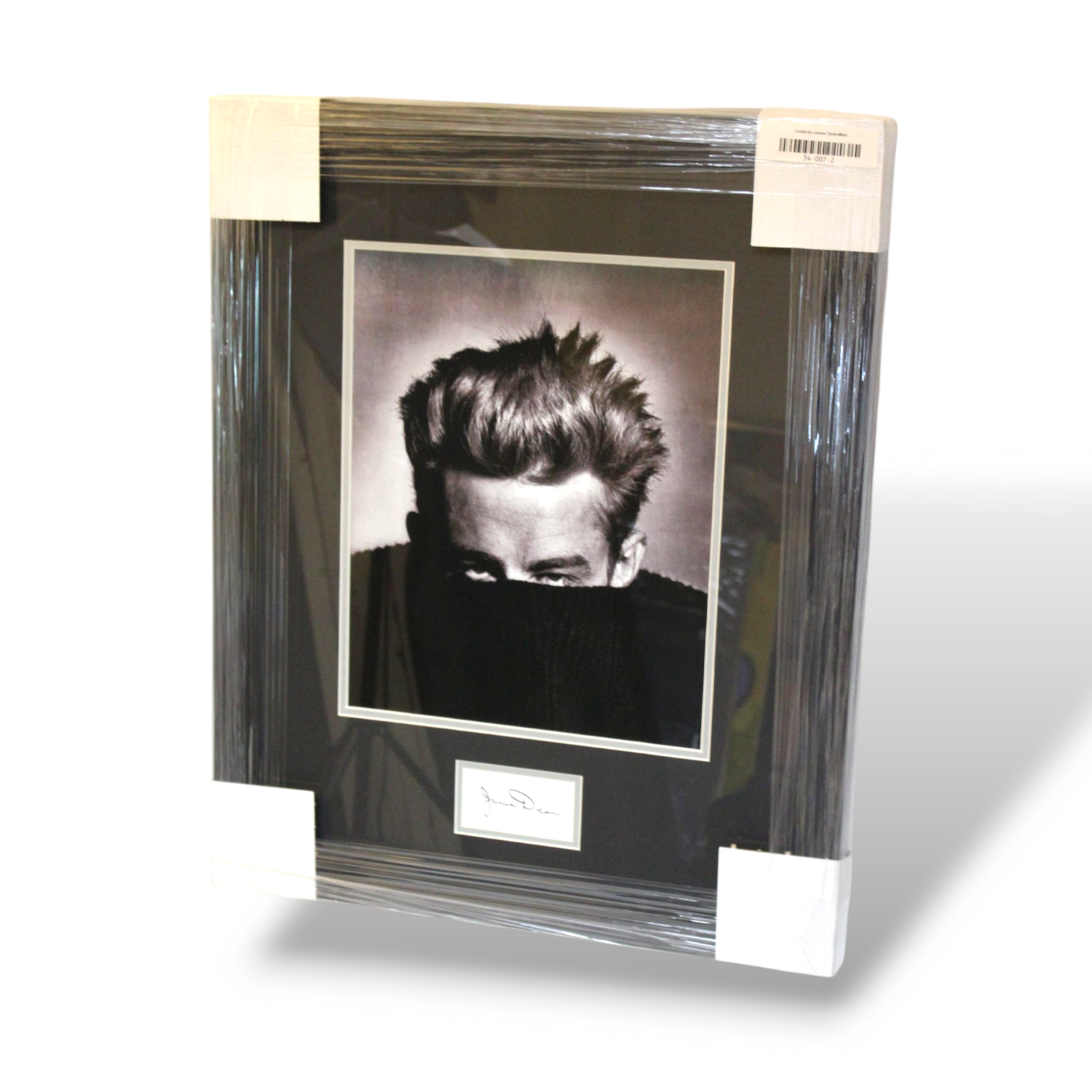 This moody black-and-white framed portrait captures the mysterious intensity of James Dean, a cultural icon whose short life left a lasting legacy. Known for his roles in Rebel Without a Cause, East of Eden, and Giant, Dean embodied the spirit of 1950s rebellion and became a timeless symbol of youth, angst, and cinematic brilliance. This collector’s piece includes a replica of Dean’s autograph, authenticated by Beckett, and is elegantly framed and matted. A striking tribute to Hollywood’s most enduring legend of cool.