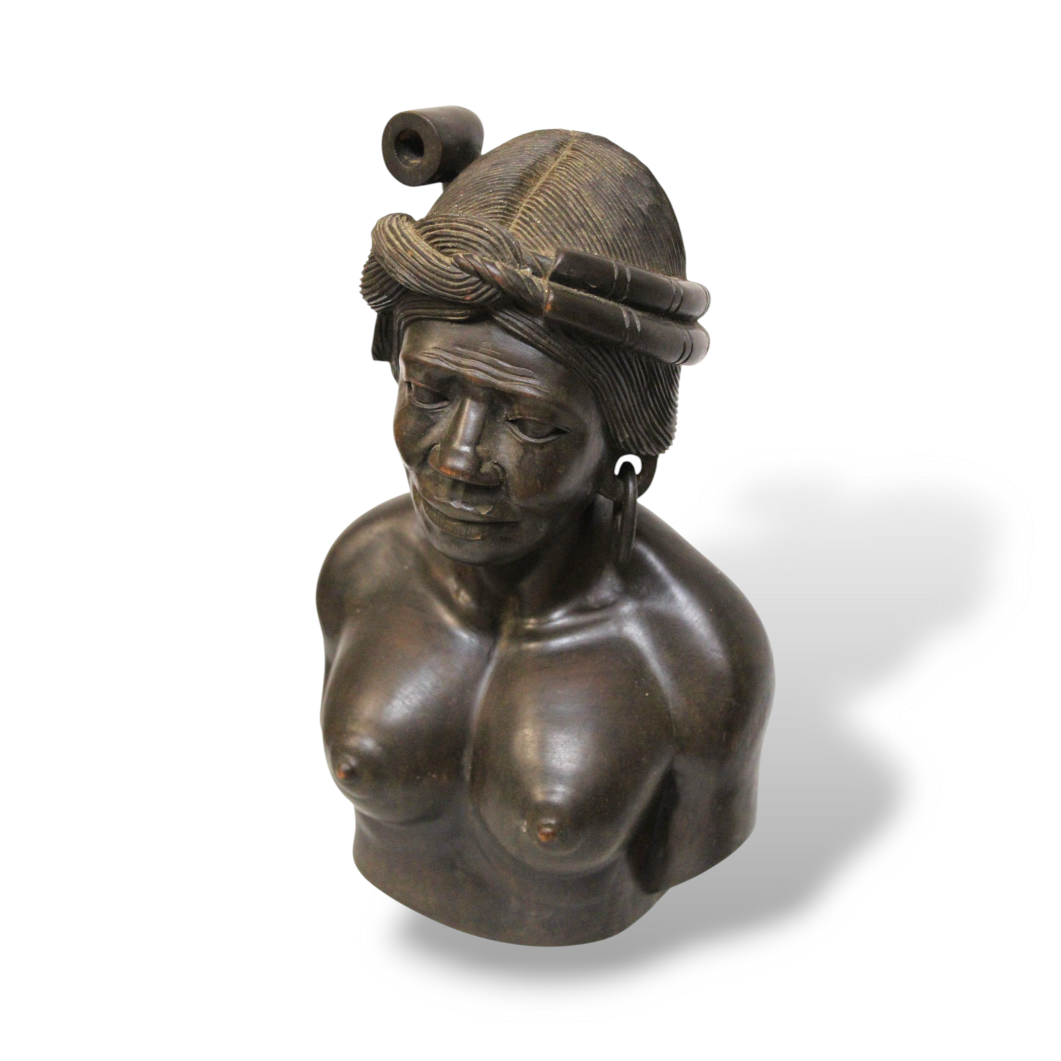 Luzon Lady Bust - A female bust carved from hardwood of the Igorot people, an indigenous peoples inhabiting the mountainous regions of northern Luzon in the Philippines. They are known for their unique culture, including their traditional religion (often referred to as animism), their intricate rice terraces, and their fierce independence. The term "Igorot" is a collective term, and they are further divided into several ethnolinguistic groups like the Ifugao, Bontoc, Kalinga, and Ibaloi. One available.
