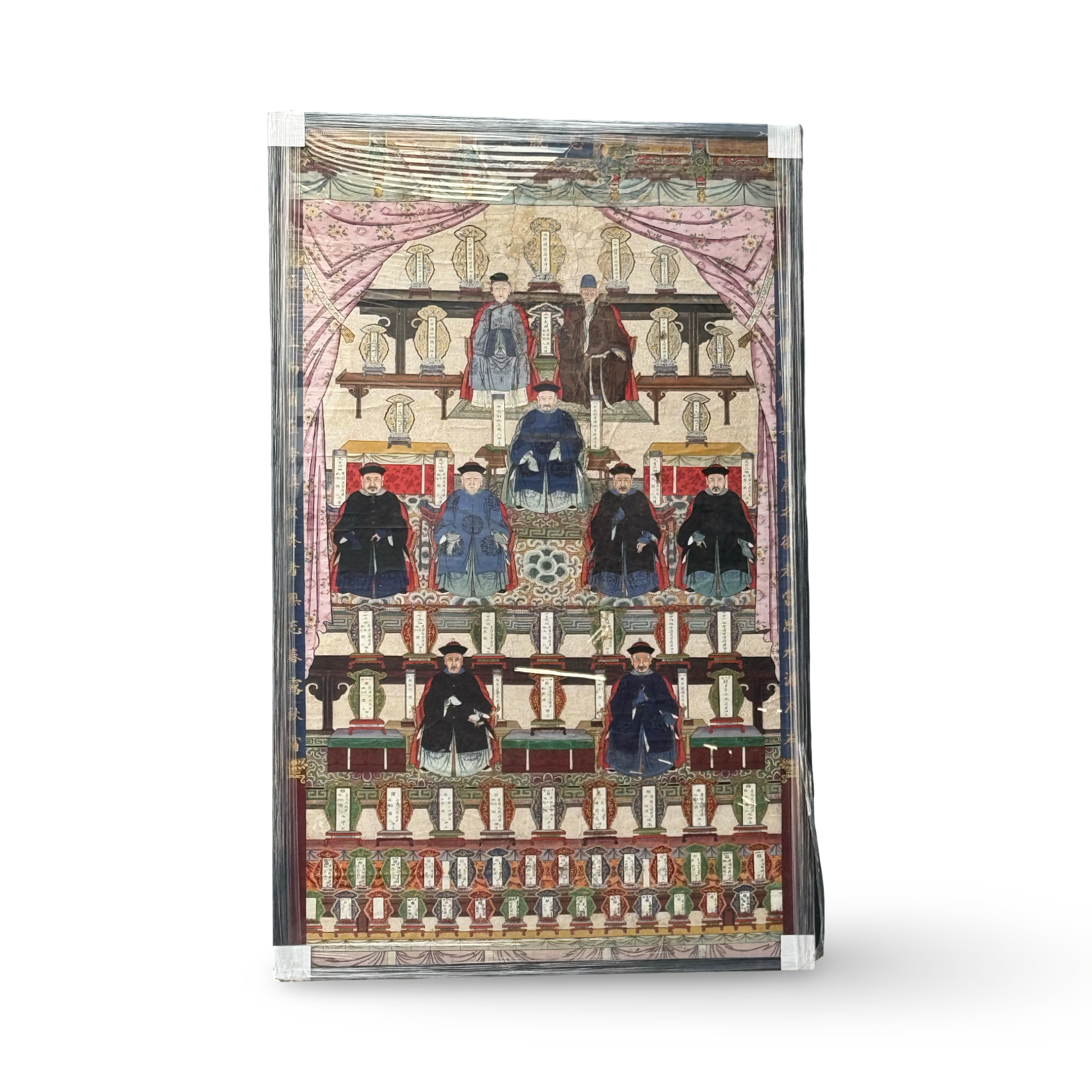 "Ancestry"- A framed over-sized hand-painted antique Chinese scroll. Creased in several places.