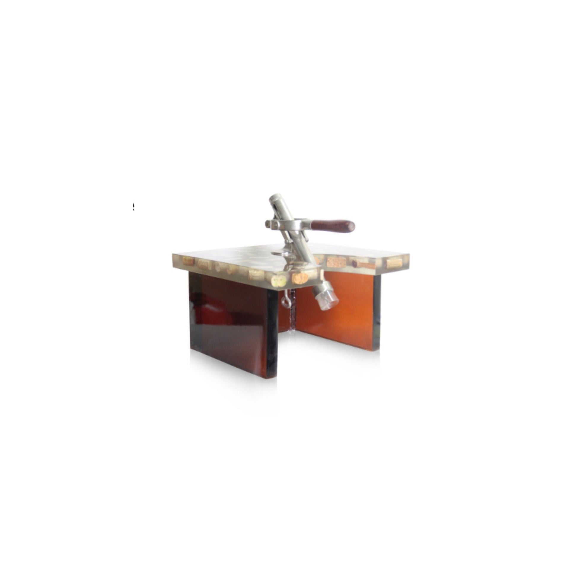Reminiscent of vintage industrialist ingenuity, the “Montel” wine opener cove was conceived by a Texan mixologist to pay tribute to the perennial art of winemaking. The roof of this nostalgic apparatus embodies a collection of wine corks nestled & suspended within clear resin under-painted in espresso. A vintage wine opener is mounted in a creviced top to allow bottle access and is supported by translucent merlot hued walls
