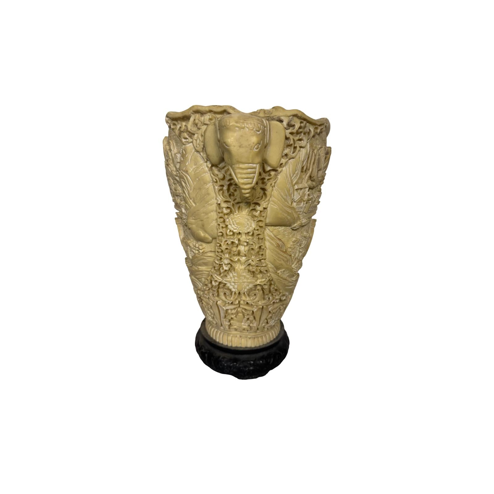 Chinese White Cinnabar Lacquer Vase – Relief Landscapes & Figures, Elephant Handles (slightly damaged).